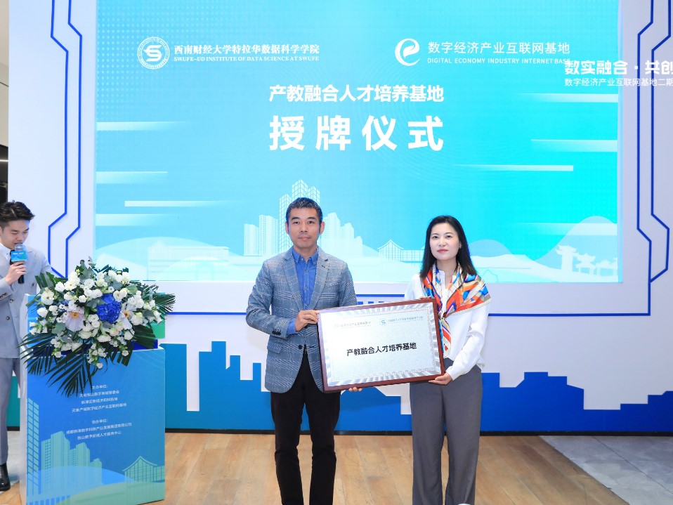 向天象产城数字经济产业互联网基地授牌,成都天象智慧产城科技服务有限公司副总经理陈萧萧代表天象产城接牌,双方将共建产教融合人才培养基地。此次合作旨在加强校企合作,实现资源共享、优势互补,共同培养具有创新精神和实践能力的高素质人才,增强发展新动能。